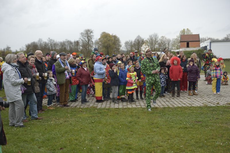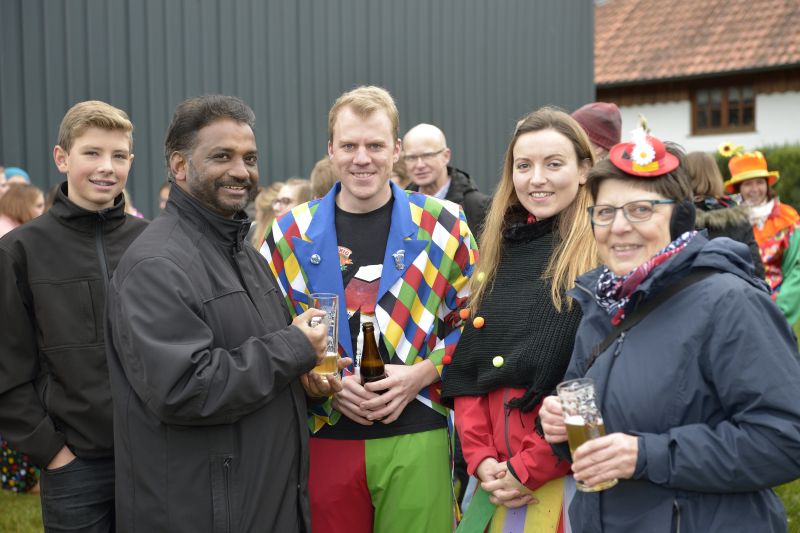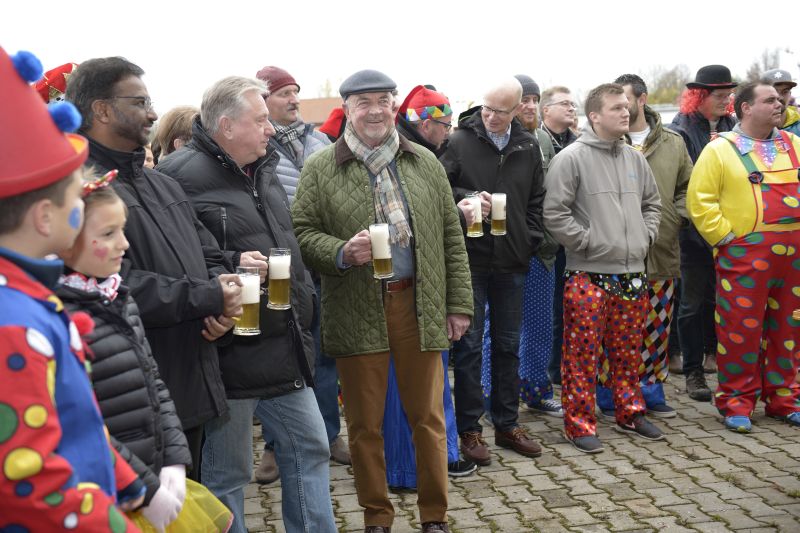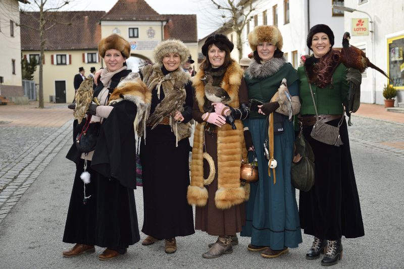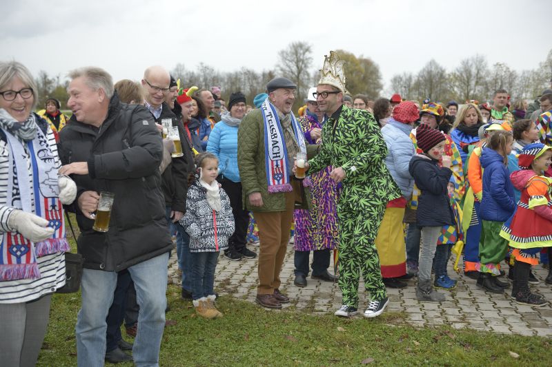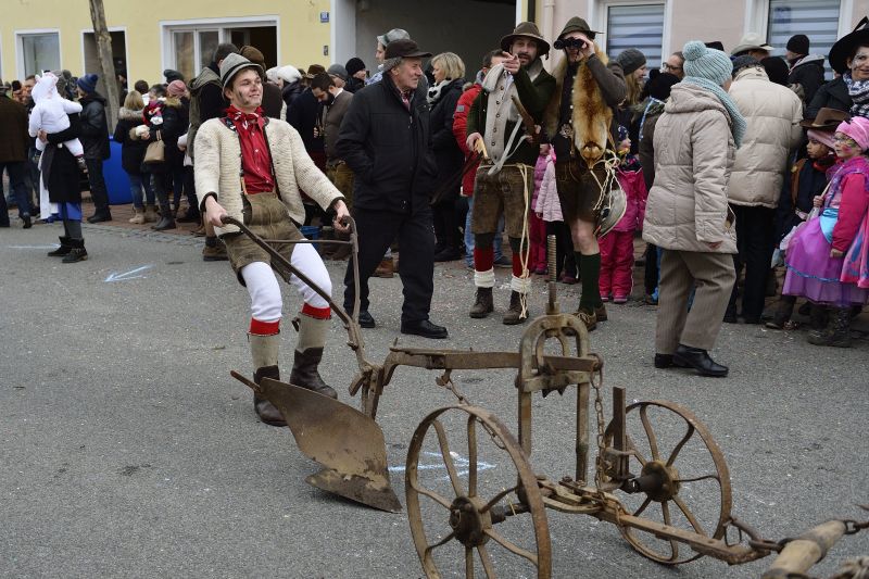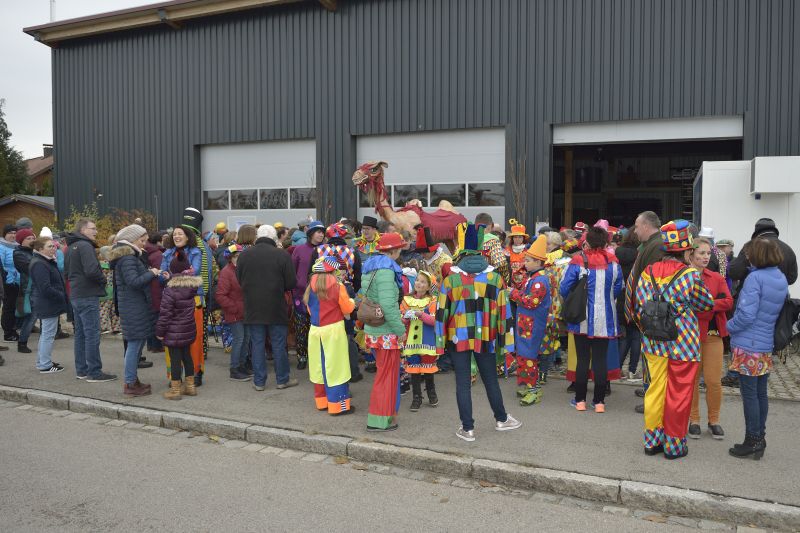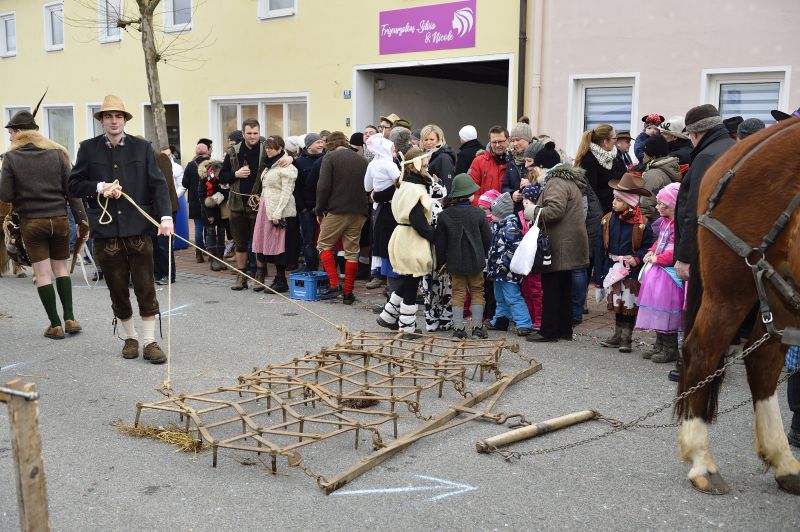Bei bewölktem Himmel wurde der Teisbacher Fasching in bester Stimmung beim traditionellen Faschingsanbau zünftig ausgesät. Zahlreiche Besucher konnten das beeindruckende Spektakel ohne Regenschirm genießen.